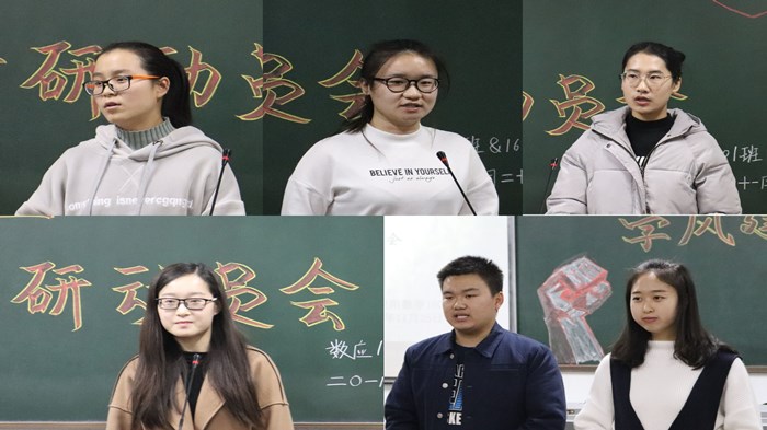 首先成国栋老师从四个方面强调了进一步加强学风建设的重要性。一是深入学习贯彻落实全国高校本科教育工作会议精神和全国教育大会精神,引导和激励学生刻苦读书学习,强调取消“清考”制度。二是围绕学校中心工作,以更加优良的校风、学风迎接教育部本科教学工作合格评估。三是秉承数学系优良系风、学风,落实每学期学情分析会提出的相关整改事项,解决好高年级学生学业松懈、思想心理迷茫等问题。四是持续做好每学期至少召开一次核心素养系列主题班会,促进学生成长成人成才。他全面回顾总结了近五个学期以来班级学风建设情况和整体工作情况,特别表扬了聂晓慧、王佳、闫玉丹等十余名同学坚持刻苦学习、积极参加各类学科竞赛和创新创业训练项目,两个班近50名同学连续四个学期保持了无挂科的良好学习状态。对个别后进生真诚劝诫提醒,激励全班同学保持清醒头脑,动员大家积极备战考研,做一个有追求、勇担当、能吃苦、敢作为的进步青年。