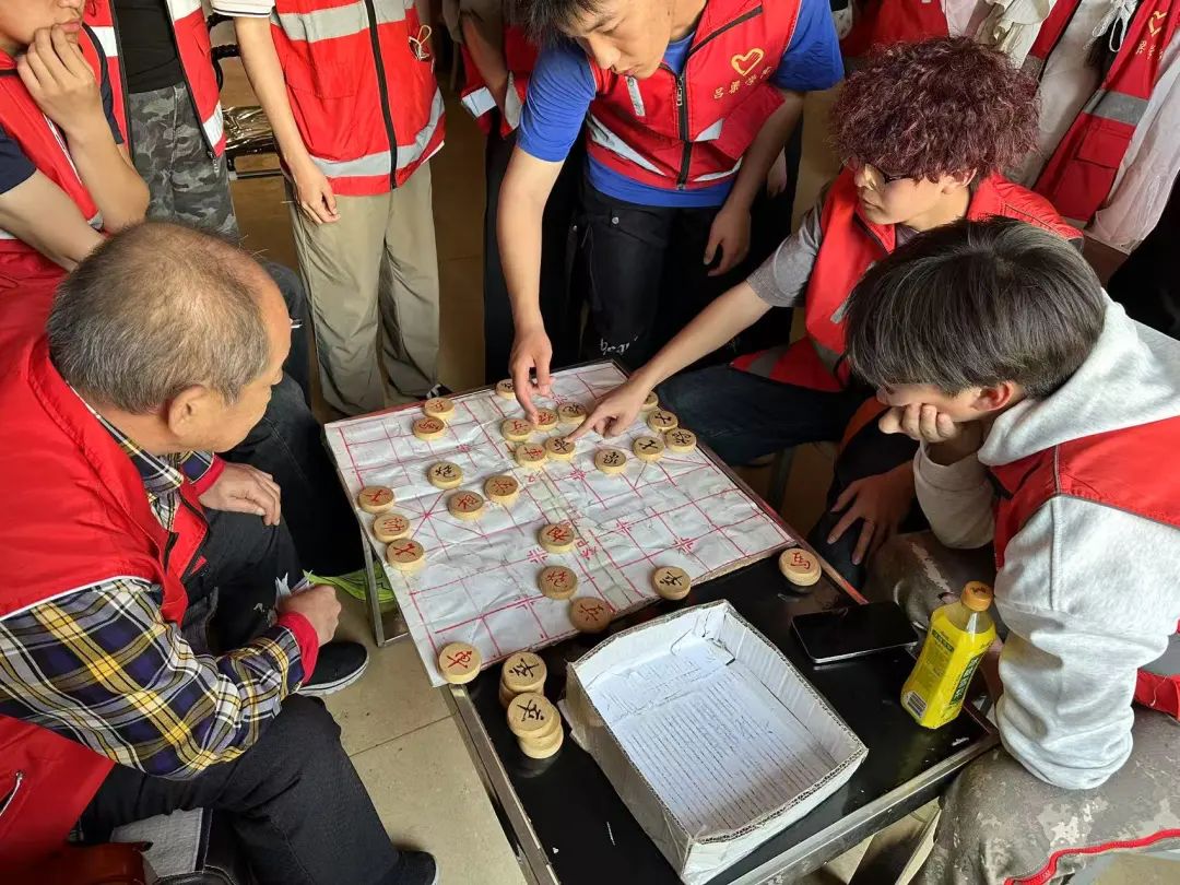 学生志愿者们与老人围坐在一起,让传统活动绽放温情。象棋桌前,棋盘如镜映着两代人的专注,“爷爷这招‘马后炮’真厉害!”赞叹声里,楚河汉界化作交流的桥梁;折纸区里,彩纸在指尖沙沙作响,学生们握着老人略显颤抖的手,一步步教折千纸鹤,“您看,这样对折就成型了”,褶皱间藏着耐心与关怀。阳光掠过桌面,落在棋子的纹路与彩纸的边角,将欢声笑语酿成岁月里的温暖片段,让每一次对弈、每一次折叠都成为跨越时光的心灵对话。