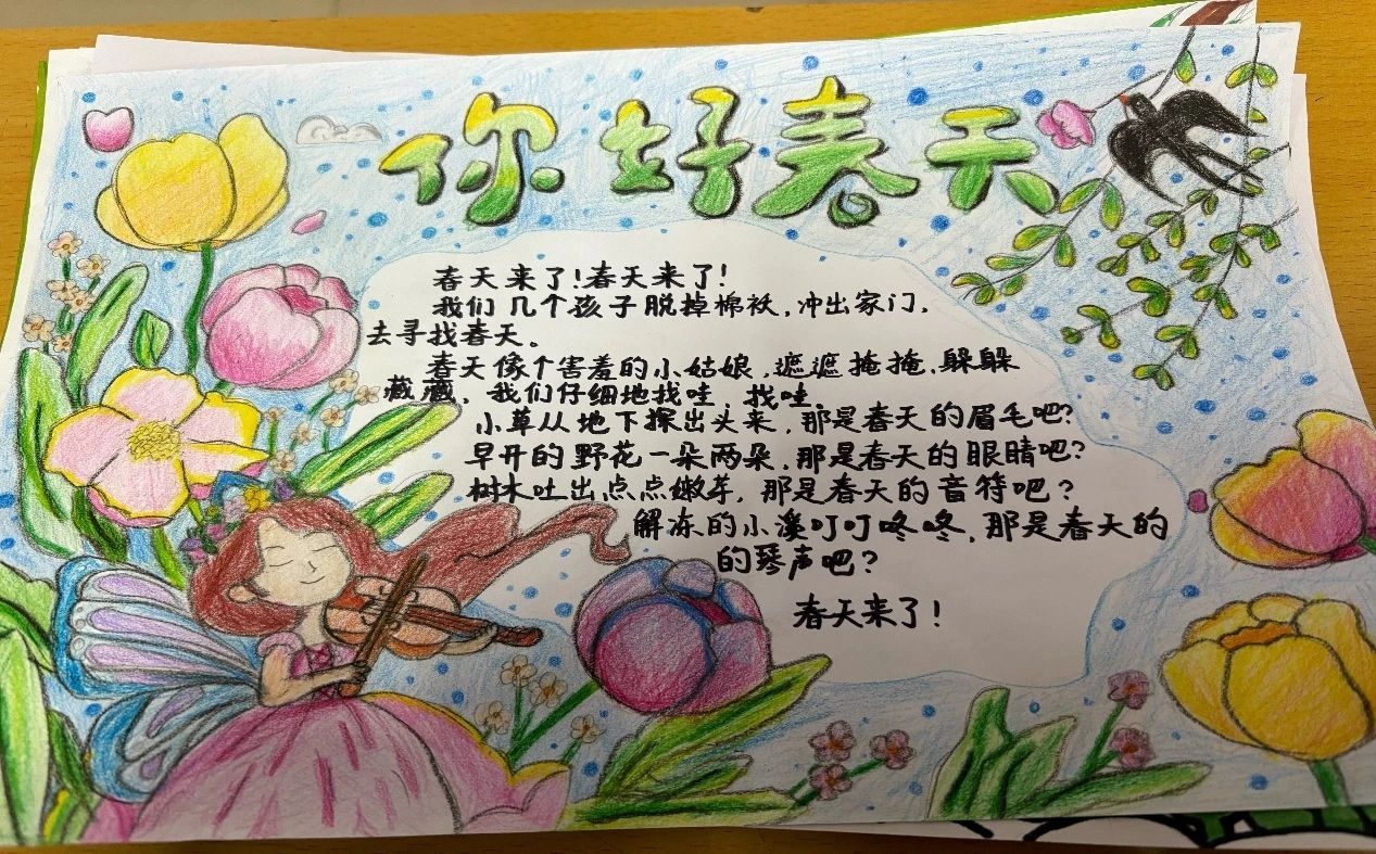 在本次活动中,同学们通过画笔,捕捉早春的灵动瞬间,征集的作品中,既有以水波荡漾为灵感的极具生命力的油画报,也有记录校园春日景色的美丽画卷;同学们用稚嫩的笔触画出抽芽的柳枝与归燕,用生动而有趣的想象力与创造力画出一副又一副春日胜景。这些手抄报不仅是艺术作品,更是一份份独特的春日观察笔记。用心描绘春天,他们就是春天!