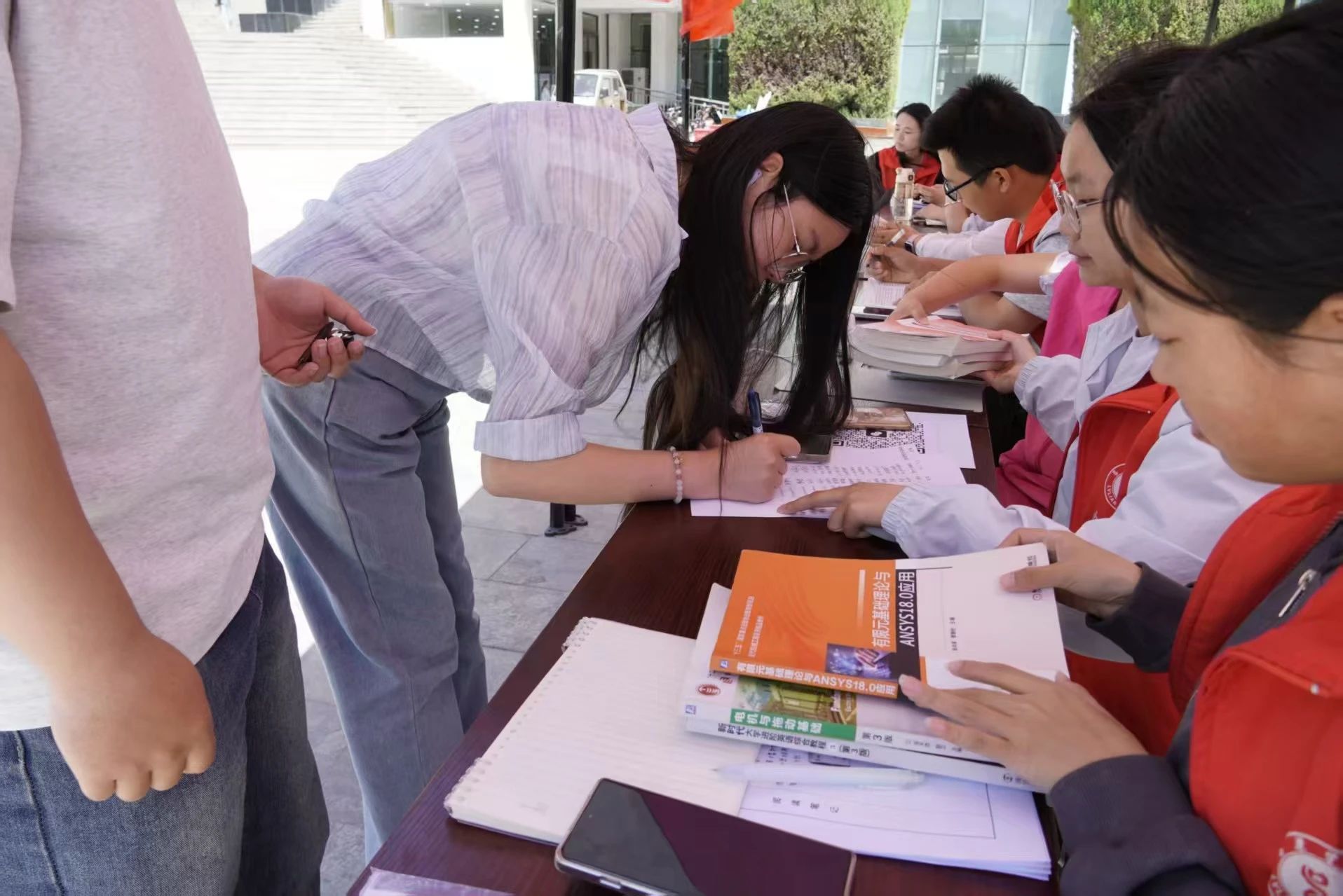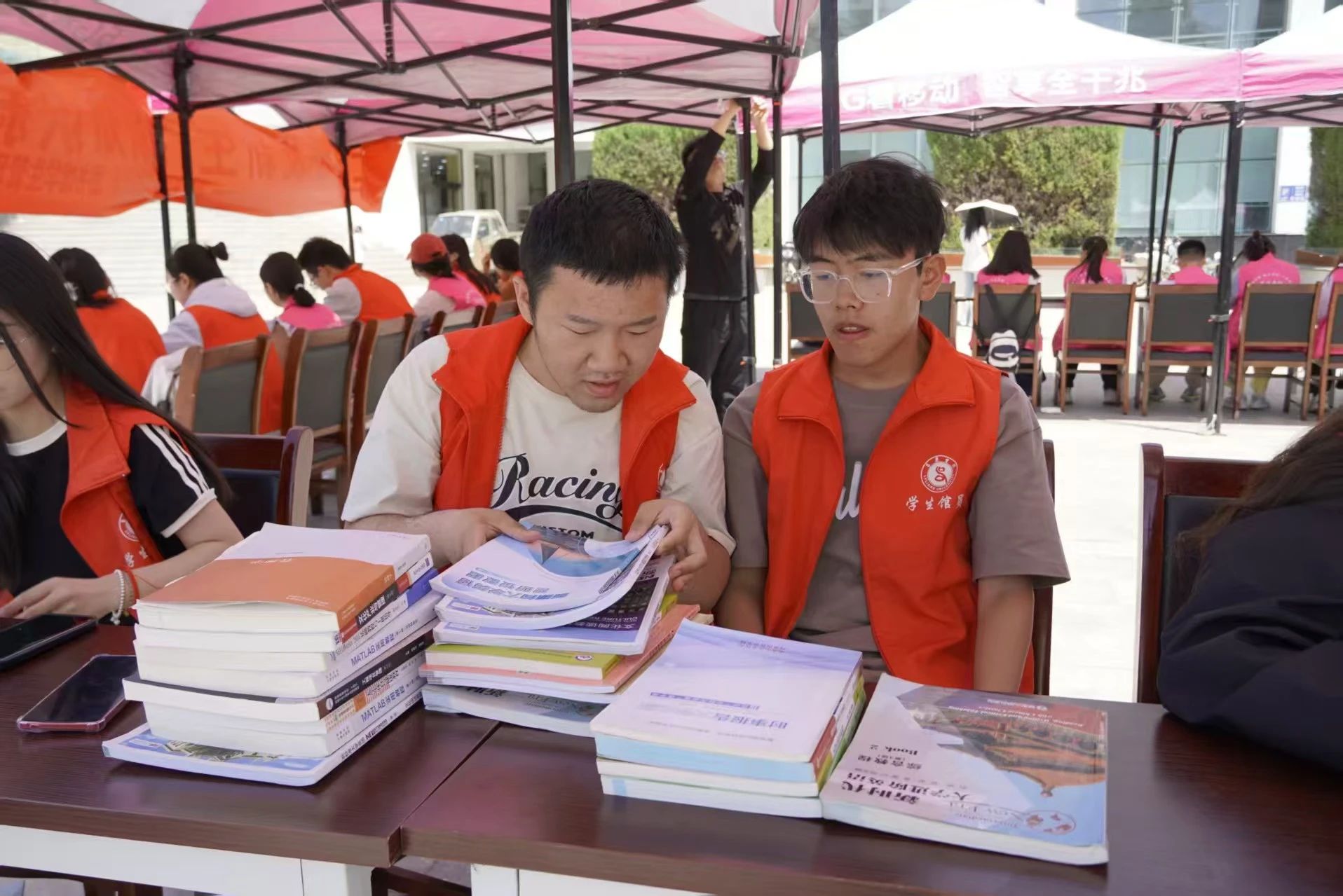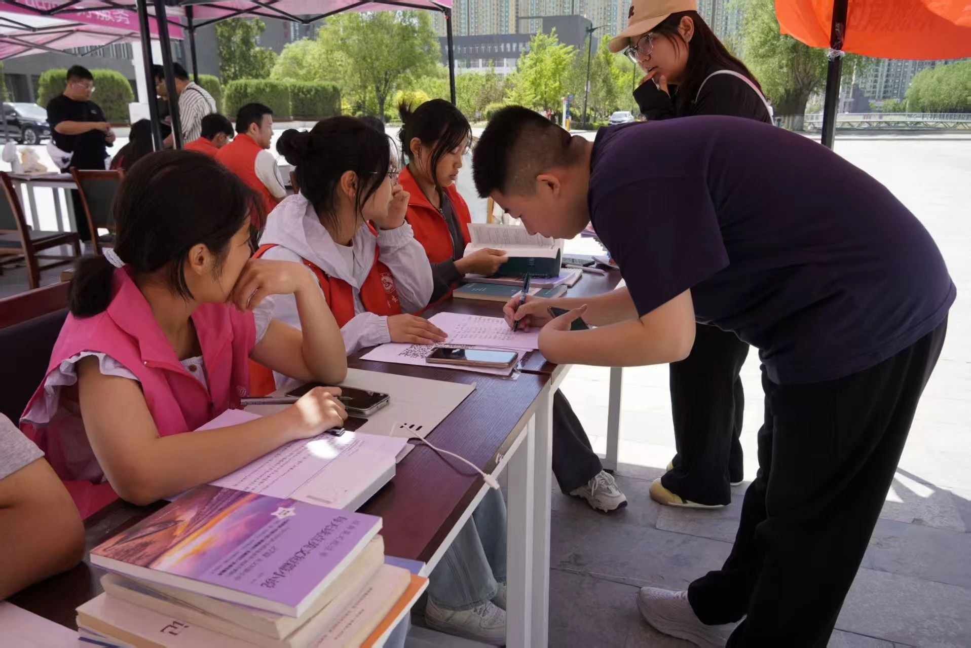现场,工作人员分工明确、有条不紊。在书籍捐赠区,同学们有序排队登记捐赠信息;在分类整理区,志愿者们仔细甄别每一本书籍,按照人文类、经济类、工学类等类别,将它们整齐摆放,为后续的高效利用做好准备。同时,负责人组织参与人员进行纸质版签到,确保活动各个环节紧密衔接、有序推进。