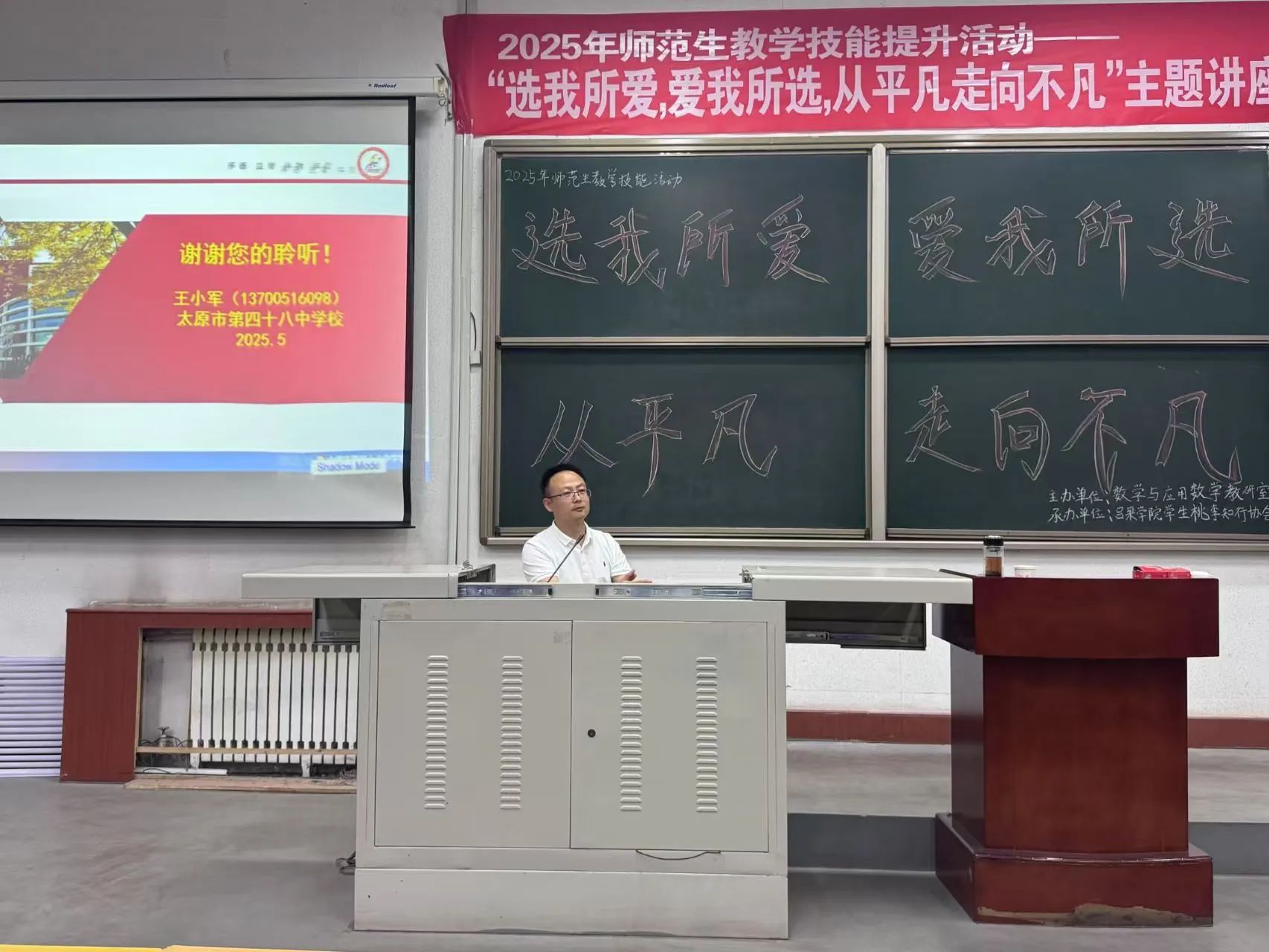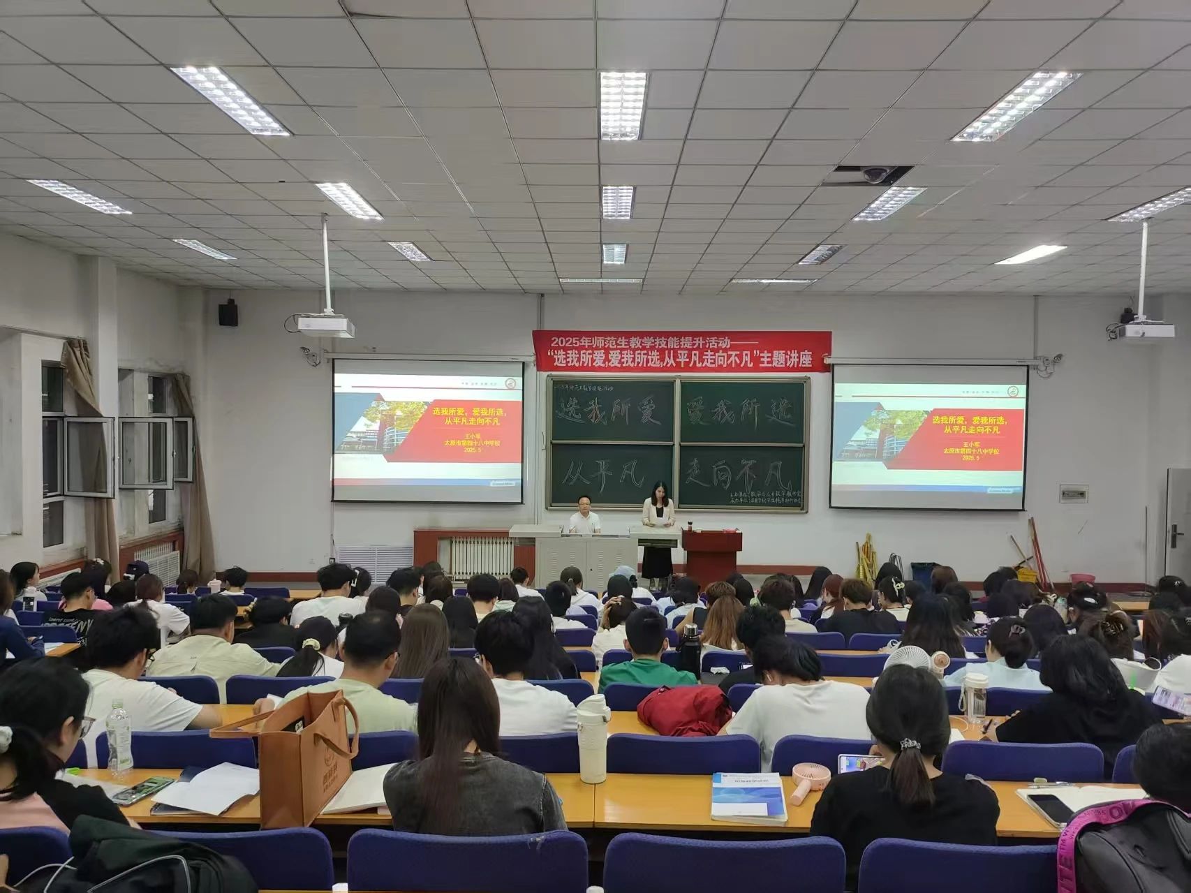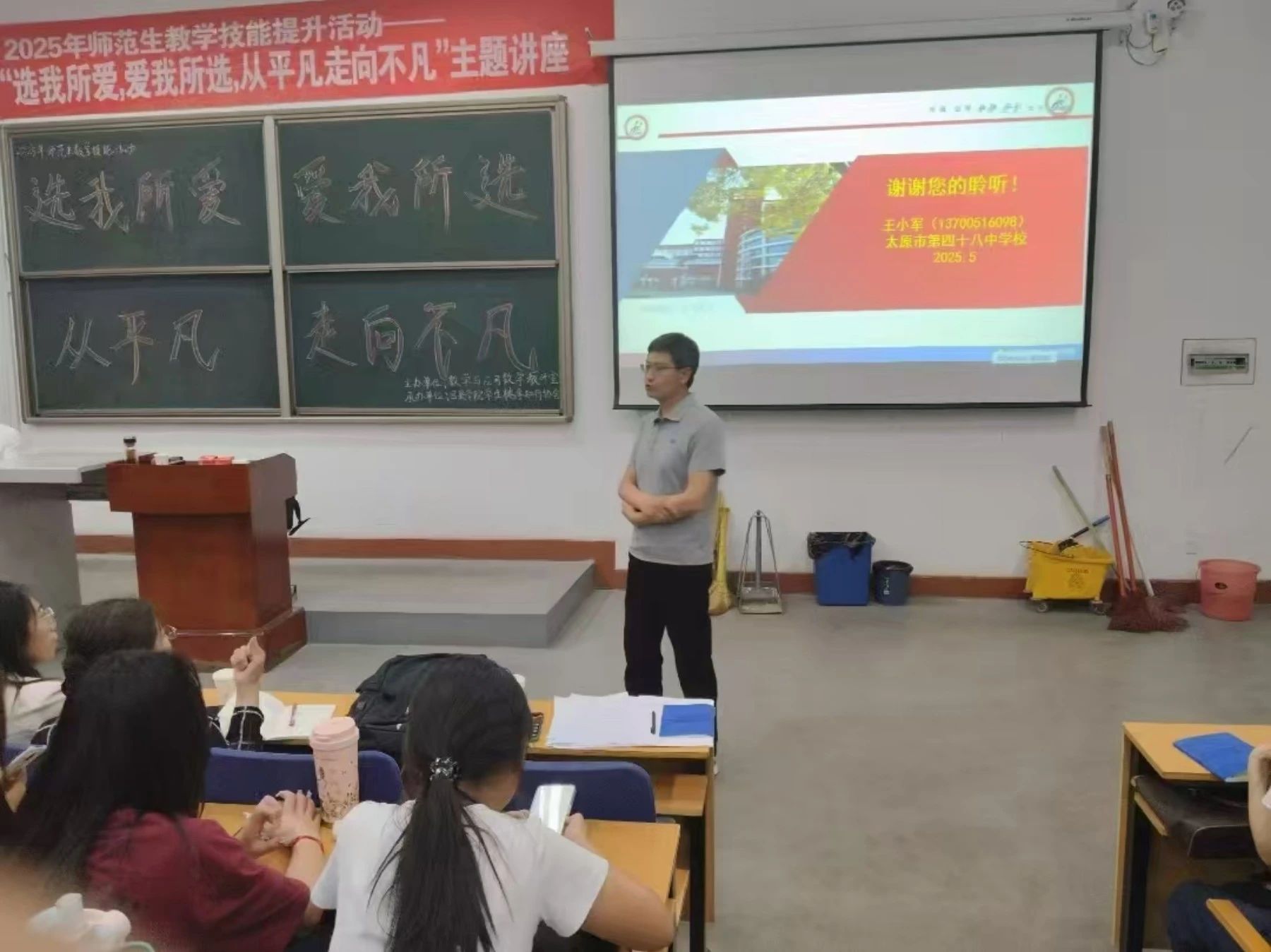 为提升师范生教学技能,强化教师职业素养,我系于5月22日在2C-202开展“选我所爱,爱我所选,从平凡走向不凡”主题讲座活动。本次活动通过太原第48中学王小军老师现场授课与经验分享,帮助同学们掌握先进的教学方法,提升课堂教学能力。
