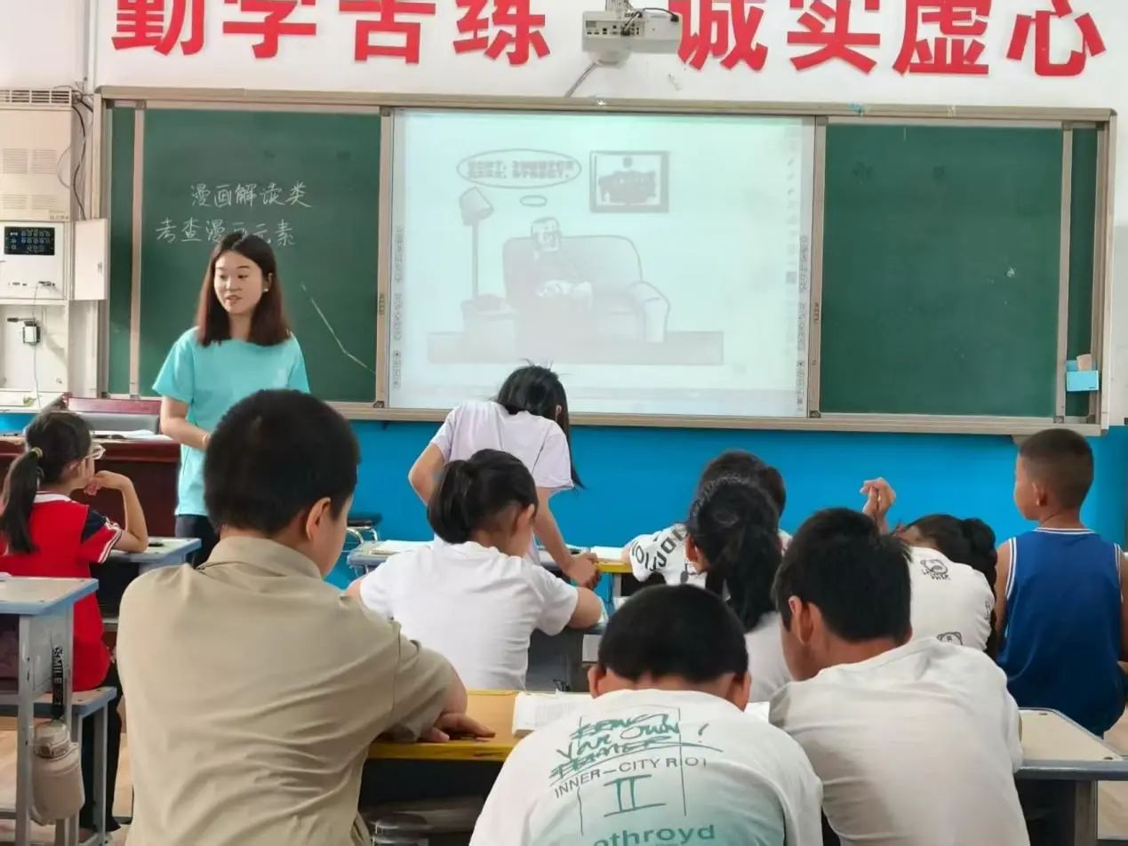 课堂上,多元课程齐绽放。围绕“漫画解读”主题的课程里,志愿队借助生动投影展示漫画,用趣味讲解、互动问答,让知识轻松“住进”孩子们脑海。美术课上,志愿者带领孩子观察生活、发挥想象,用画笔勾勒多彩世界,一幅幅充满童趣的作品在课堂诞生;体育课中,志愿者组织趣味运动,力让校园洋溢活力,锻炼孩子们体魄。