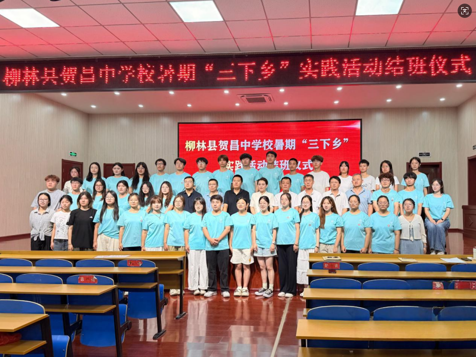 仪式尾声,全体人员合影留念。镜头定格的瞬间,不同年龄、身份的身影并肩而立,身后是 “柳林县贺昌中学校暑期“三下乡”实践活动结班仪式”的背景板,眼前是未褪的夏日阳光。