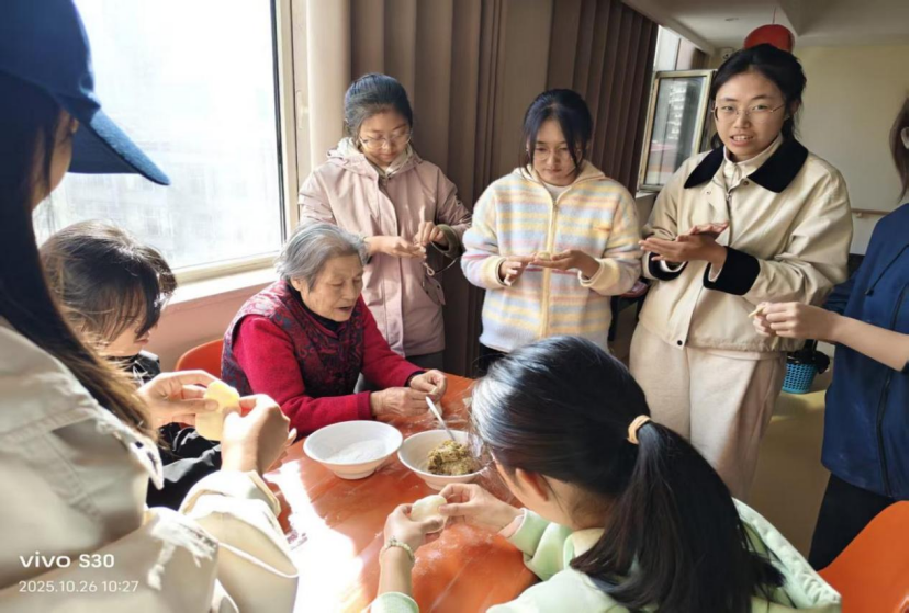 最后,活动进入了最温馨的“携手包饺子”环节。食堂里,志愿者们洗净双手,与爷爷奶奶们围坐在一起。和面、擀皮、调馅、包捏……大家分工协作,有说有笑。经验丰富的老人成了“技术指导”,手把手地教志愿者们如何捏出馅大肚圆的“元宝饺”;而志愿者们则发挥创意,包出了形态各异的“太阳花”“小兔子”饺子,引得大家阵阵欢笑。空气中弥漫着白菜猪肉馅的香气,也充盈着浓浓的祖孙情。张奶奶一边熟练地包着饺子,一边感慨道:“和孩子们一起包饺子,感觉就像一家人过年一样,热闹,心里头暖和!”