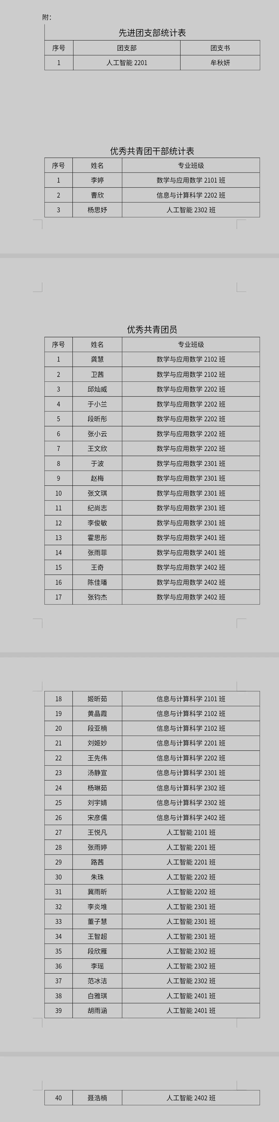 此外,经系部严格选拔、校级激烈答辩,我系数学与应用数学2201班赵一帆同学凭借优异的综合素质和突出的个人表现,成功斩获“十佳大学生”称号,为我系师生树立了优秀榜样。除此之外,经学生本人申请,分团委推荐,校团委考核审查,授予人工智能2201团支部“先进团支部”称号,授予我系3名同学“优秀共青团干部”称号,40名同学“优秀共青团员”称号。颁奖环节后,我系学生赵一帆作为十佳大学生代表发言。她结合自身学习、工作经历,分享了在志愿服务、社会实践、岗位建功中的成长感悟,号召全体青年坚定不移地听党话、跟党走,努力成为有理想、敢担当、能吃苦、肯奋斗的新时代好青年,在强国建设、民族复兴的伟大事业中,积极展现青春力量,以奋斗之姿践行“请党放心,强国有我”的青春誓言,到祖国最需要的地方去发光发热!