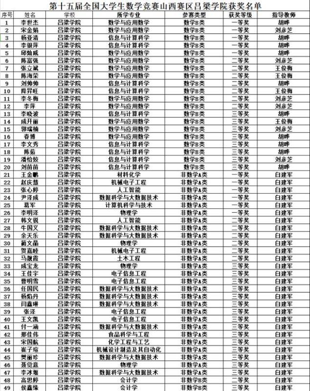 近日,第十五届全国大学生数学竞赛初赛成绩揭晓,我校学生获奖率历史最好,位于全省同类院校前列。数学专业组40名同学参赛,获奖20名,获奖率为50%,高于全省获奖率35%,其中:一等奖5名;非数学专业组参赛人数47人,获奖人数29名,总体获奖率为61.7%,高于全省获奖率35%,其中:一等奖6名。