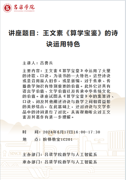 吕勇兵讲座通知——王文素《算学宝鉴》的诗诀运用特色