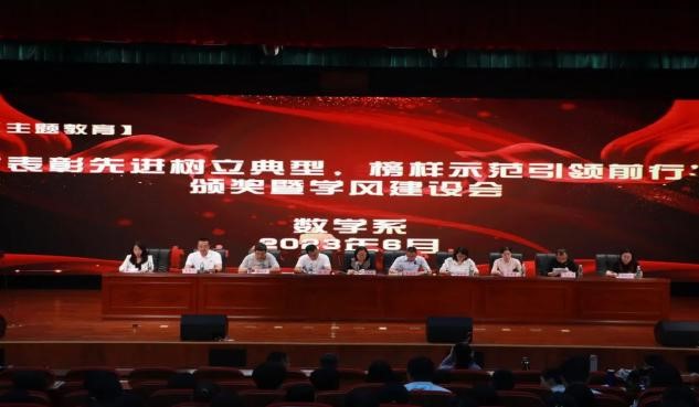 6月6日下午,数学系召开学习贯彻习近平新时代中国特色社会主义思想主题教育“表彰先进树立典型,榜样示范引领前行”颁奖暨学风建设会。数学系全体师生约800人参加了此次大会。党总支书记段金狮主持会议。会议共三个部分内容,第一部分颁奖,第二部分系主任李香林讲授专题党课,第三部分签订诚信考试承诺书。
