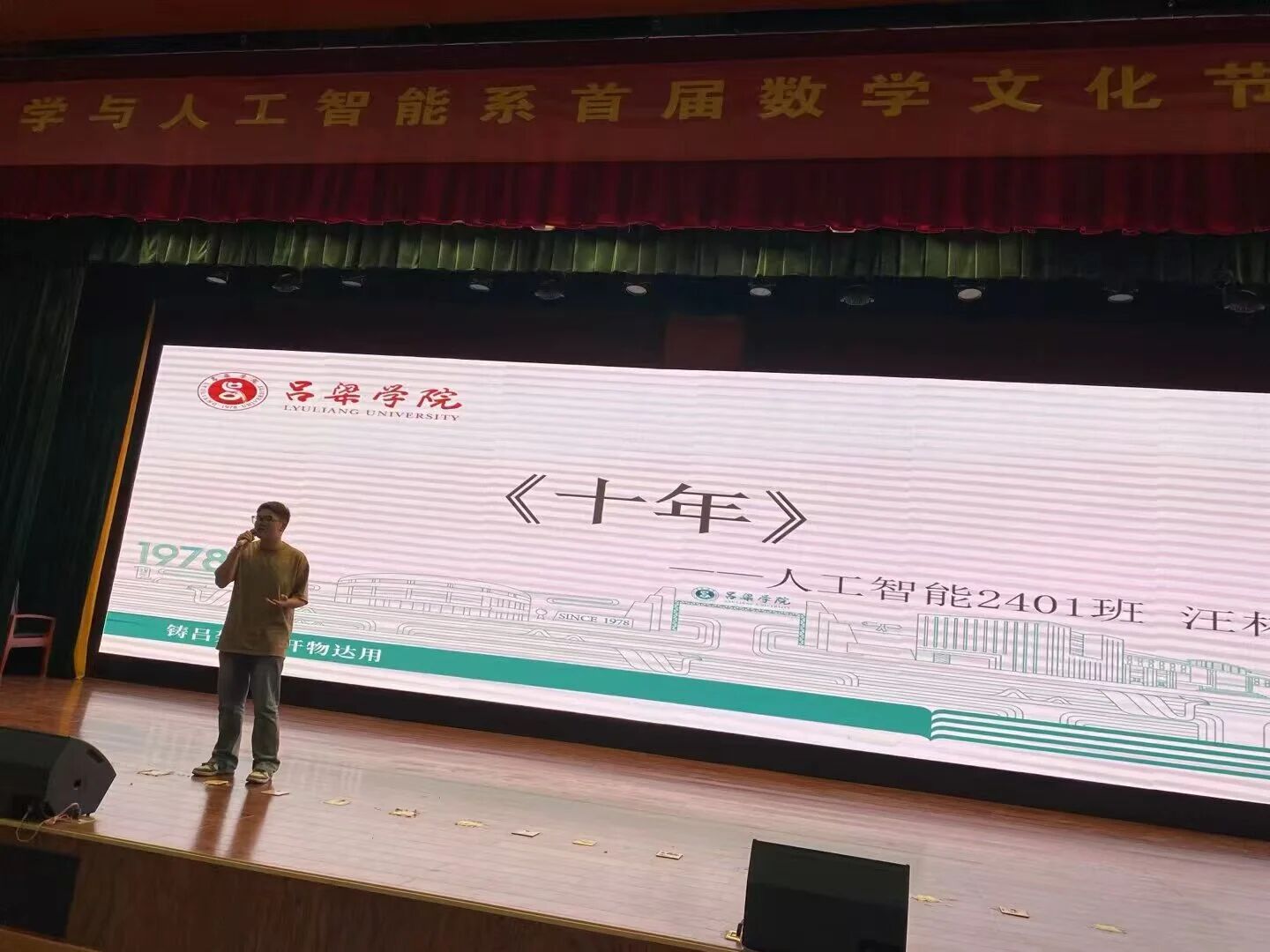 若说数学是理性的诗篇,那歌声便是感性的注脚。在趣味活动环节,人工智能 2401 班的汪林枫率先登场,带来经典歌曲《十年》。熟悉的旋律在报告厅内流淌,瞬间拉近了与现场师生的距离,温馨氛围弥漫全场。紧接着,信科 2501 班的范蕾以清澈透亮的嗓音演绎《想想念念》,让在场师生沉浸在青春独有的纯粹与美好之中;随后,该班史雅倩演唱的《探窗》更是赢得阵阵掌声。
